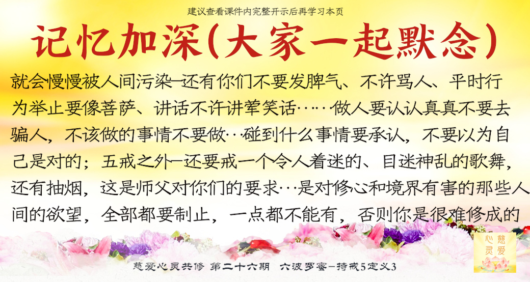 在你心中要有这么个戒律。什么叫戒律?师父虽然对你们没有明确的规定,不要你们守五戒,但是你们要记住:你们守的戒要比五戒还要多,如果你们守不好戒的话,你们就会慢慢被人间污染。师父平时给你们讲了这么多学佛的理论、学佛的基础,目的是什么?就是让你们好好守自己的戒。我这个“戒”不止五戒,其中还有你们不要发脾气、不许骂人、平时行为举止要像菩萨、讲话不许讲荤笑话……这些是不是师父给你们的戒律啊?做人要认认真真不要去骗人,不该做的事情不要做,这是不是戒律啊?碰到什么事情要承认,不要以为自己是对的,这是不是戒律啊?我没有必要一条一条拿出来让你们遵守,我是让你们好好地学,要从平时的生活当中让学佛成为一种自然。