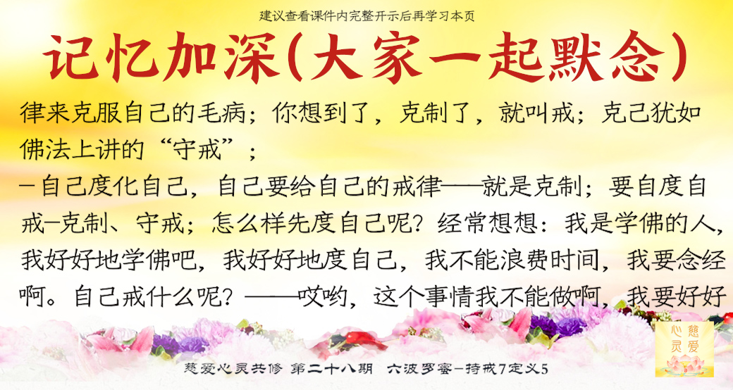 我们要自己度化自己,自己要给自己的戒律---就是克制。哪些我不能做的,哪些我可以做的,哪些我应该克制住,但是哪些我可以没有关系,慢慢地再改。人要懂得守戒,人要懂得自度。把自己度好了,你才能度别人。你自己不守戒,你怎么让别人来听你的话呢。你自己在家里不能以身作则的学佛,脾气改好,你怎么让你的先生、怎么让你的孩子会听你的话呢。