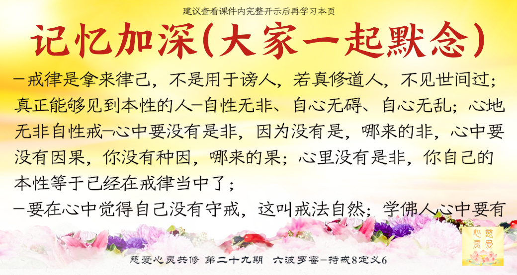 “自性无非”就是本性没有是非。你心里没有这个是对的,那个是错的,你已经是戒了。你的心对这件事情没有说“它是对的”,没有说“它是错的”,你不就已经戒住了吗?贪是怎么来的?如果你觉得这个事情是对的,那你就贪了。“应该是我拿的”,你是不是贪啊?“这个事情明明是他错了,为什么算在我身上啊?”你瞋了。“这个事情我也能做的,他能做总理我也能做总理啊!”你愚痴了。所以你的本身心里有这些作为的混原体,这种混原体在你心中让你心不平。混原体是你是非的动力。因为在你心中有对和错,有是和非,那么你就不能守戒,你就戒不了。所以菩萨一句话点破我们世人心,叫“心地无非自性戒”。比方说这件事情是他做错了,你觉得,“哎呀,我也有错”。这件事情孩子没有做对,“哎呀,这是孩子生活当中必经之路啊”。实际上你就戒了,你就戒了瞋恨心了。你本来很恨孩子,“怎么又犯错误了?怎么又做错了?”而现在你觉得没有是非,孩子没有做错。“我的女儿可能年纪小碰到这些事情了,我要原谅她。”你觉得这个没有是非,这是孩子在生活中应该碰到的挫折,以后会改的。那么你不就戒了吗?是你自己戒了,不是戒在她身上,是你自己不瞋恨了。如果看见自己女儿,“最好去找一个有钱人家”,你这个贪念一来你怎么守戒啊?因为你觉得“是啊,有钱好”,“是”来了,接下来就有“非”了。“是啊,一定要有钱的人,我要嫁给他。”好了,你有这种贪念来了,你怎么戒啊?所以菩萨一句话全部点破——“心地无非自性戒”,就是在心中要没有是非。