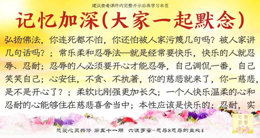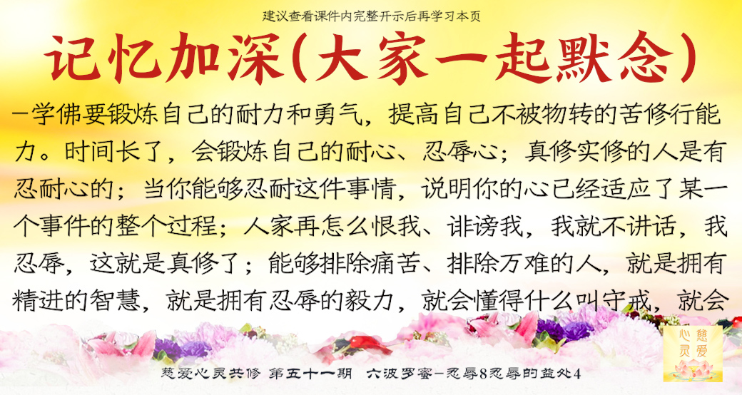 忍耐的人不会伤心,忍耐的人不会刺痛自己的心;不能忍耐才会失守,不能忍耐才会骂人骂到别人的祖宗。要学会珍惜,要懂得忍辱精进。想要保护好自己的心脏、肝脏和心灵,一定要懂得忍辱,学佛的忍辱心就是精进心。